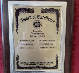 KMAC 2020 Student of the Year Award of Excellence (Plaque Ceremony) held on Saturday, April 9th, 2021 2020 Recipients: Female Recipient: Katelyn L. Male Recipient: Joshua F. Student of Year – Award of Excellence (Junior Category) This honor is awarded annually to either one student, or, (1) male and (1) female student, who exemplifies certain characteristics reflecting the (5) tenets of Taekwondo (see definitions below). The nominee(s) is/are chosen by Grandmaster Jung based on the merits of him/her […]